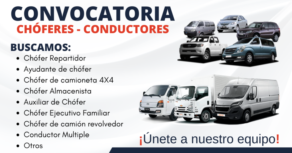 Hoy brindamos información de importantes empresas que desean contar con chóferes o conductores con mínima experiencia en diferentes sectores, si te gusta conducir vehículos livianos o pesados y tienes tus papeles vigentes, esta es tu oportunidad para ser parte de una de las compañías que requiere de talentos como tu, sin mas te invitamos que revises toda la información mas abajo.