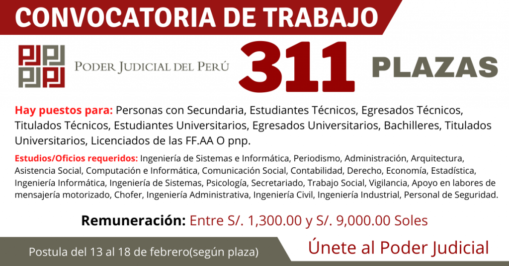 Hay puestos para: Personas con Secundaria, Estudiantes Técnicos, Egresados Técnicos, Titulados Técnicos, Estudiantes Universitarios, Egresados Universitarios, Bachilleres, Titulados Universitarios, Licenciados de las FF.AA O pnp.